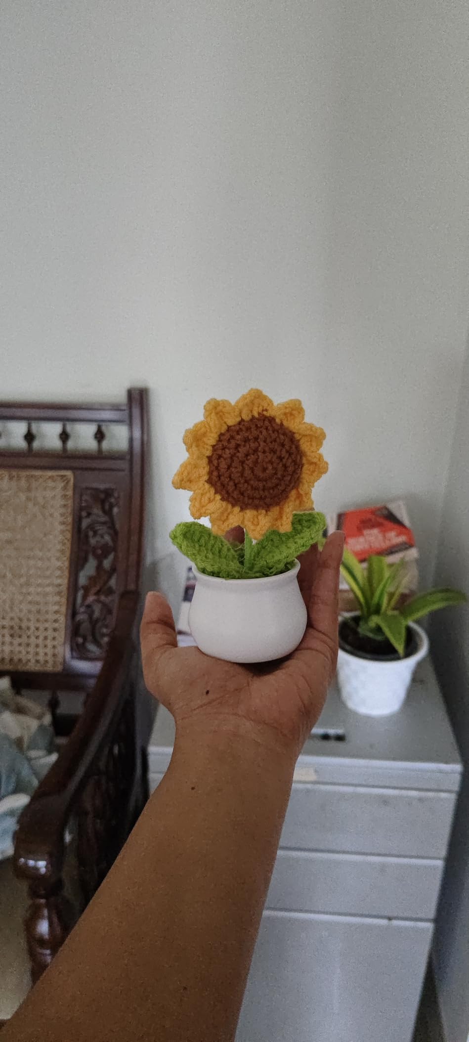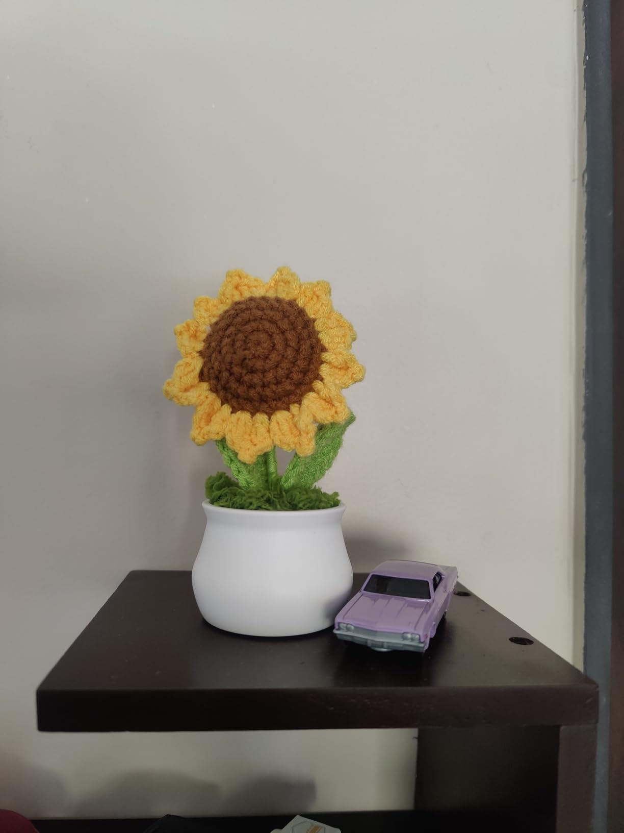 - Handmade Crochet Sunflower – Symbol of Positivity: Brighten any space with this adorable potted crochet sunflower, symbolizing warmth, happiness, and sunshine. A thoughtful handmade gift that brings positive energy to your desk, study table, or car dashboard.