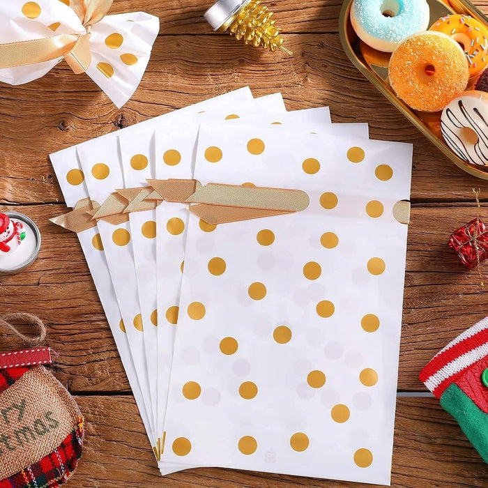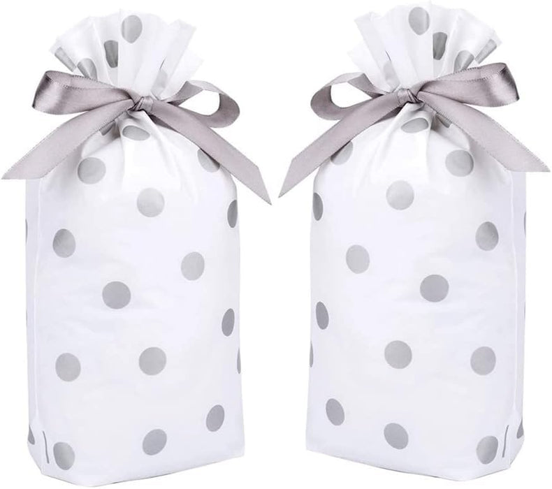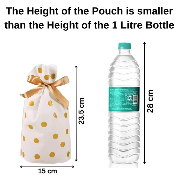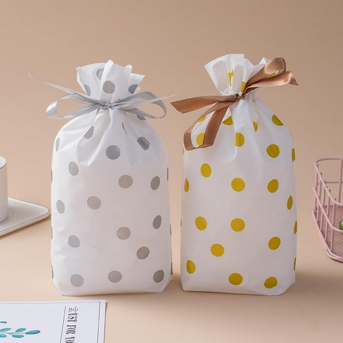 - Elegant Polka Dot Design – Stylish white gift bags with golden or silver polka dots, finished with a satin ribbon bow, perfect for return gifts and festive packaging.